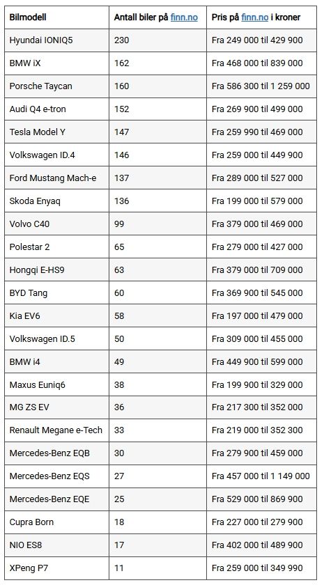 (Tallene er samlet inn 14. mai 2025. For hver enkelt bilmodell er det variasjon i utstyrsnivå, kjørelengde og lignende. Det forklarer det store prisspennet blant brukbilene.)